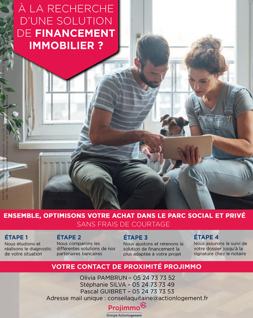 ACTION LOGEMENT c’est aussi sa filiale de Conseil en financement : Projimmo, qui accompagne vous accompagne gratuitement dans l’étude de votre projet immobilier.