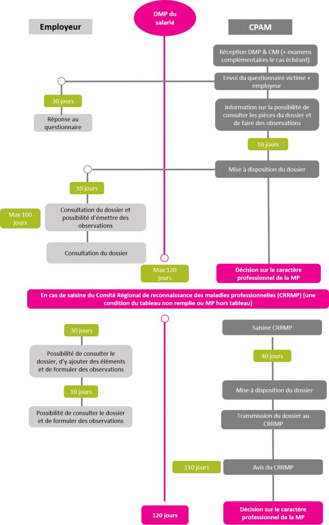 Lorsque la maladie en question n’est pas rattachable à celles listées sur le tableau des maladies professionnelles (et lorsque le taux d’incapacité de la victime est supérieur à 25 %), la CPAM saisi le comité régional de reconnaissance des maladies professionnelles (CRRMP). L’employeur et la victime disposent alors d’un délai de 30 jours francs à compter de la notification par courrier de cette saisine pour ajouter au dossier tous les éléments jugés utiles, puis de 10 jours francs supplémentaires pour consulter et commenter le dossier.